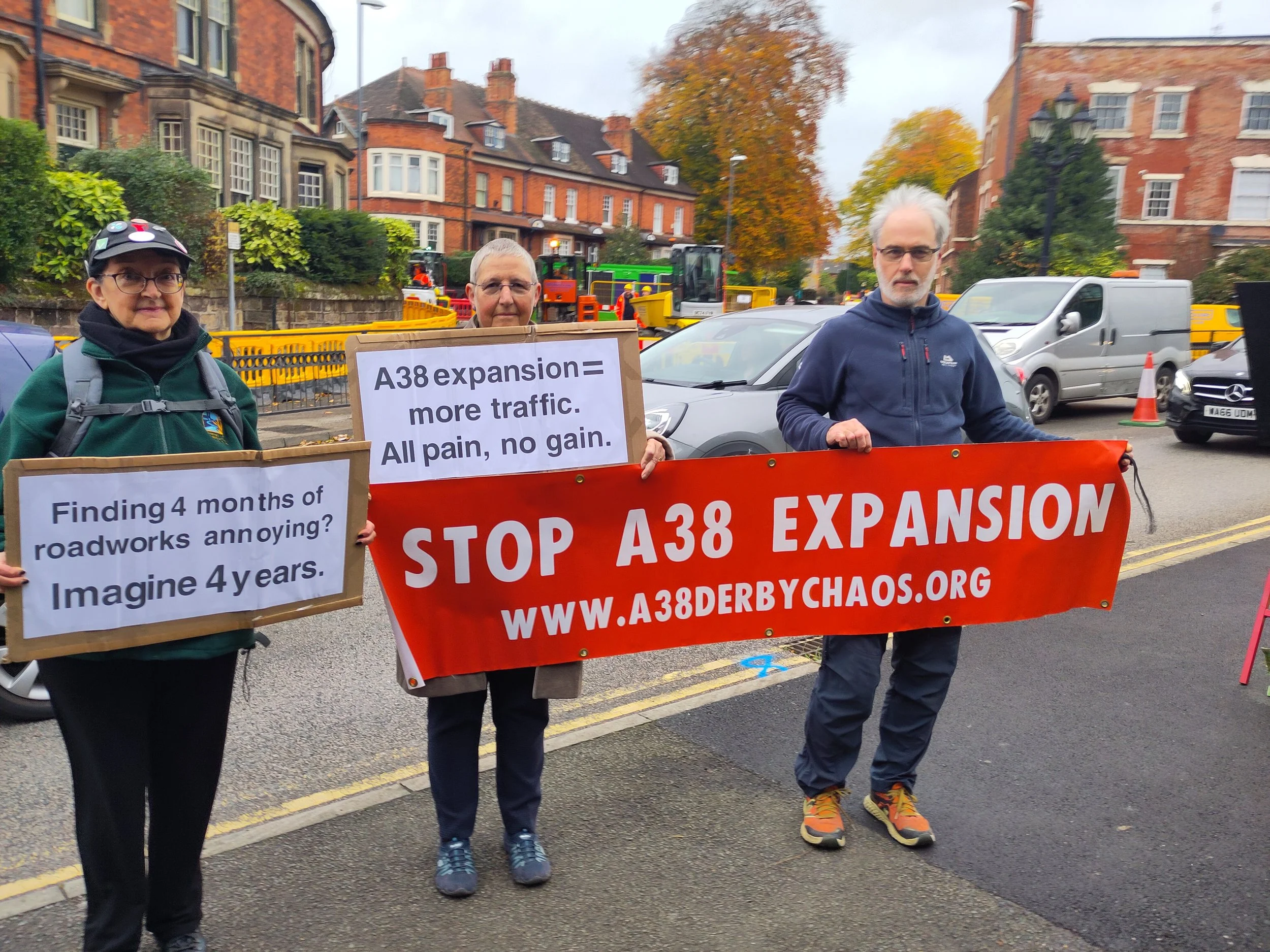 Three members of the Stop the A38 Expansion campaign who live near the A38 Markeaton junction and Kedleston Road held placards near the current Five Lamps roadworks to highlight what they call “just a taste” of what Derby will face if the A38 expansion goes ahead.